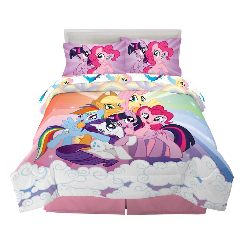 - HASBRO MY LITTLE PONY DESIGN: My Little Pony fans will be over the rainbow with this cool and colorful comforter and sheet set. Featuring Rainbow Dash, Applejack, Pinkie Pie, Fluttershy, Twilight Sparkle and Rarity, this bedding bundle is packed with all of her pony pals. Fans of Hasbro’s popular My Little Pony characters are sure to love the comfort and style of this adorable bedding.