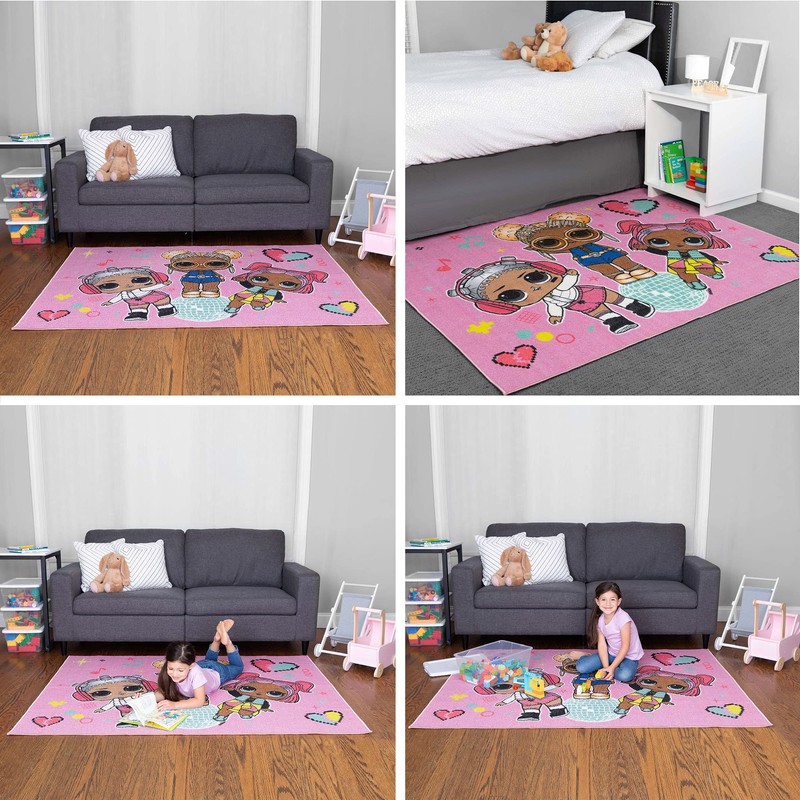 - LOL SURPRISE DESIGN: It’s no surprise why kids love this LOL Surprise area rug. Beats, VRQT, and Soul Babe from the MGA Entertainment franchise take center stage in the fun "Party Girls" pattern along with hearts, musical notes, a disco ball and a bold pink backdrop. Young LOL Surprise fans will applaud the glam look of this soft and stylish rug.