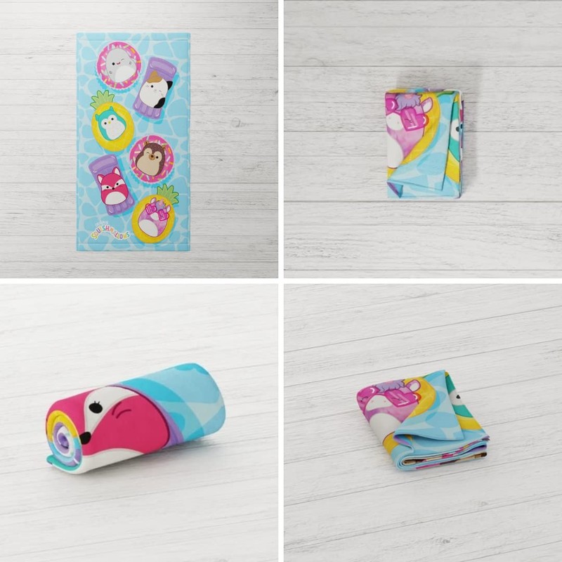 - SQUISHMALLOWS DESIGN: Bring the cute and cuddly Squishmallows to your bathing and swimming routines with this colorful "Poolside Fun" patterned beach towel. Squishmallows Cam the cat, Fifi the fox, Lola the unicorn, Hans the hedgehog, Winston the owl and Gordon the shark are happily adrift together on this high-quality towel.