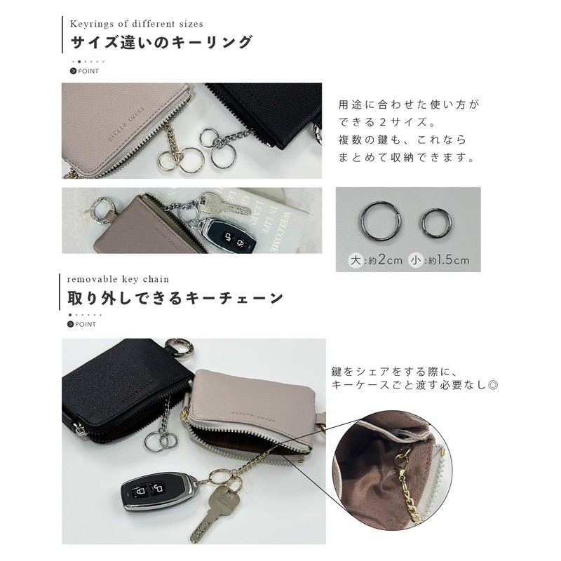 • Multi-functional and compact: Equipped with a key ring in 2 sizes large and small so you can use it according to your needs. The keychain is removable, easy to use and easy to manage keys. Dividers inside make it easy to organize small items. Plastic zippers are smooth and stress-free Comes with a rear pocket for convenient storage of IC cards and parking tickets