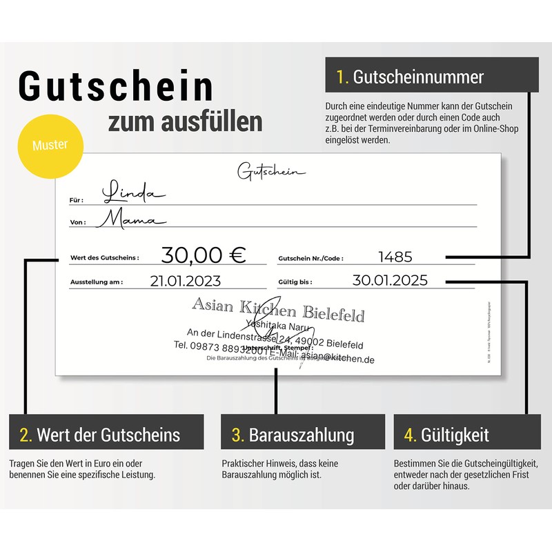 - Blank voucher to fill in – all relevant information available for legally compliant voucher issuance – create your own vouchers e.g. for voucher credit