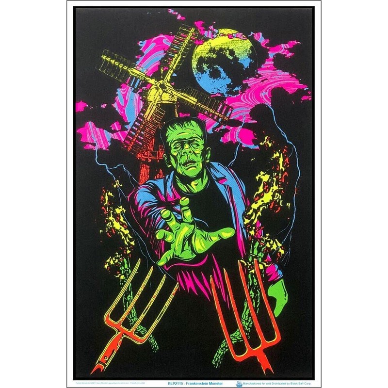 - Sized 23.5" x 35.5" to Complement Any Room: This poster of Frankenstien is perfect for lightening the mood, giving any room a good times vibe in normal light, or a magical touch under a blacklight.