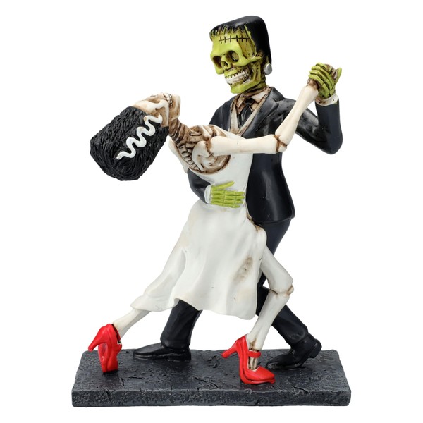- GOTHIC WEDDING THEMED The figurine features Frankenstein's monster in his typical green skin and scars, elegantly dressed in black, dancing with his skeleton bride.