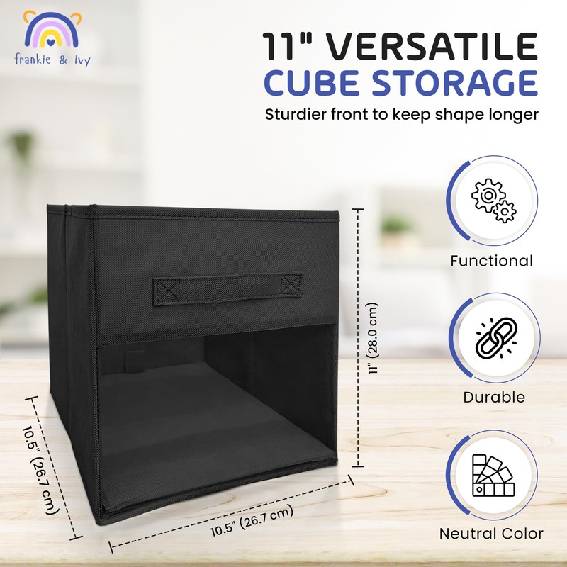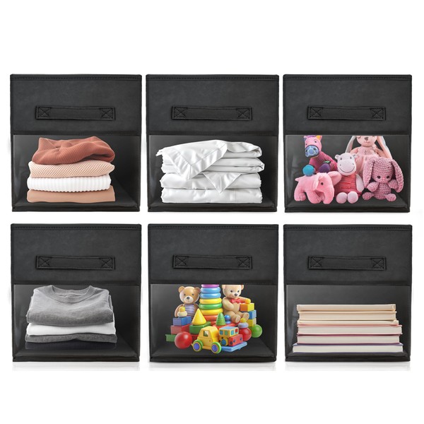 Frankie & Ivy Cube Storage Bins with Clear Front – Foldable 11” Organizers with Sturdier Front That Holds Shape for Daily Use – Sleek Black (6-Pack)