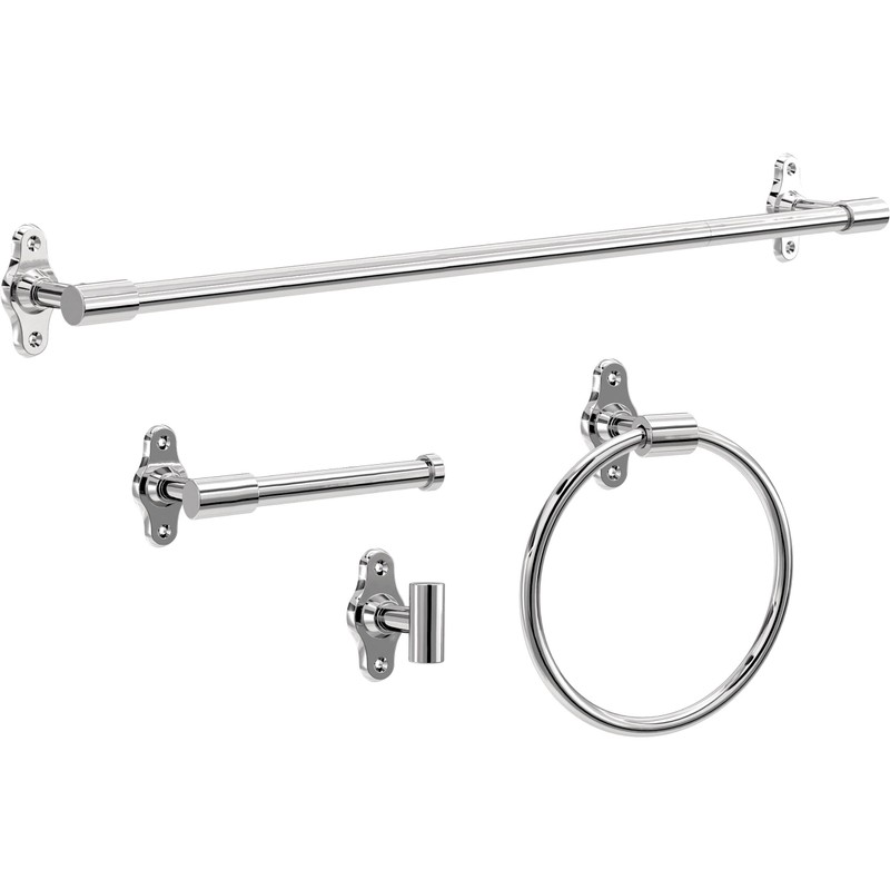 - 4-PIECE SET INCLUDES: Towel bar with a 6 in. extender piece, allowing you to extend towel bar from 18 in. to 24 in., single post toilet paper holder, round towel ring, and single hook