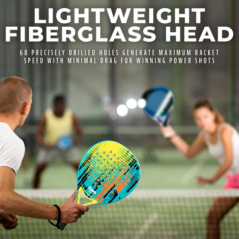 - FIBERGLASS: This fiberglass racket is lightweight and perfect for players looking to master their accuracy! Designed with 68 precisely drilled holes to generate maximum racket speed with minimal drag for power shots