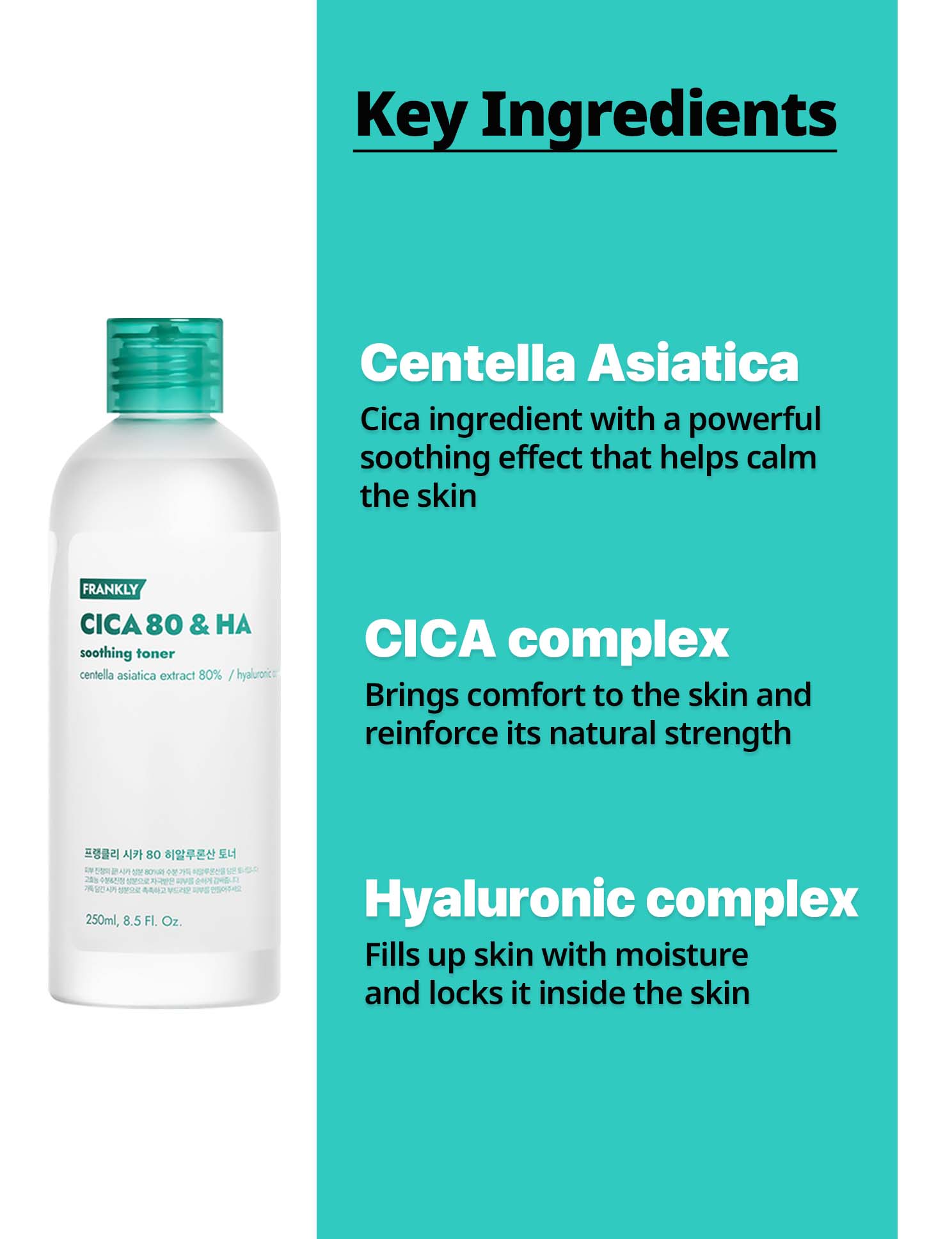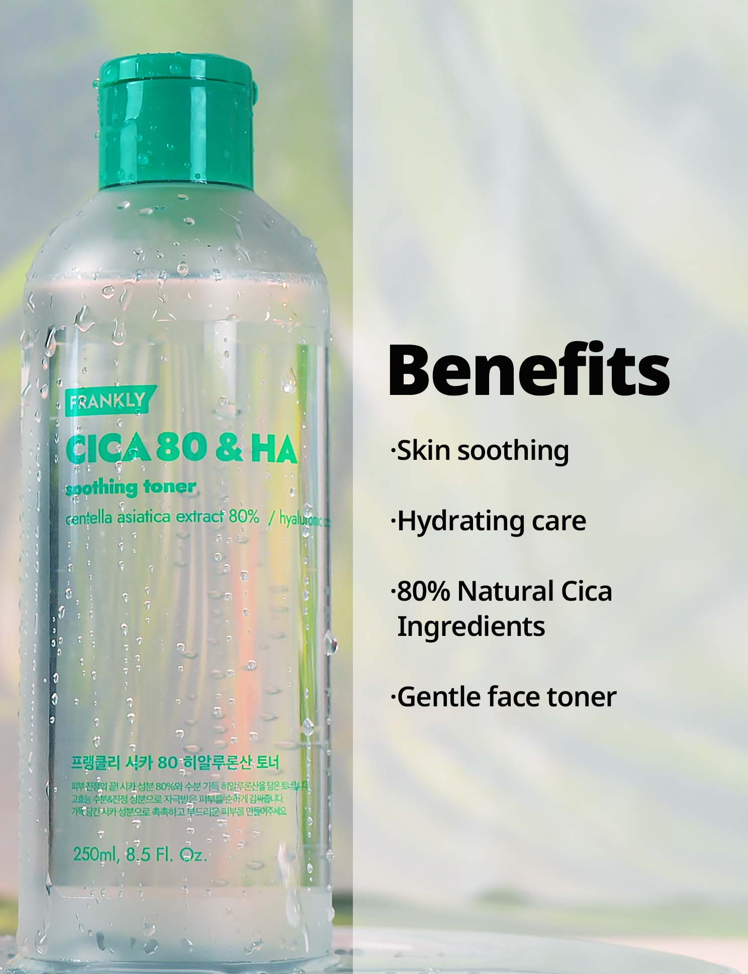It is a product that gently soothes sensitive skin. By applying a transparent price to an 80% cica toner, you can enjoy the soothing effect on sensitive skin without inflation. For sensitive skin tired from external stimuli, you can take care of it mildly and moistly with this product. It has the features of cica toner, soothing toner, cica ingredient 80%, centella asiatica toner, and 7 types of hyaluronic acid. The five strengths special to Cica 80 Hyaluronic Acid Toner are moisture, soothing, freshness, skin texture, and vegan ingredients. Recommended for when the skin is sensitive due to external stimuli, when the skin texture is damaged and becomes rough and dull, when skin troubles are visible, and when it feels tight and dry throughout the day. The customer satisfaction survey proved its effectiveness with 100% feeling the skin was calm, and 100% saying that it felt non-sticky and the skin texture was soft. It boosts the skin's innate moisture and strengthens the skin more moistly, and customer satisfaction surveys prove its effectiveness, with 98% feeling a sense of moisture to the inside of the skin, and 96% being satisfied with the moisture without tightness. It is a product that maximizes efficacy with the feeling of use and ingredients unique to Frankly’s solutions. It is a clear and transparent water type toner that contains 80% cica and is quickly absorbed into the skin. Immediately after application, it spreads gently with a soft application and is absorbed as if wrapping sensitive skin, and after 5 minutes, it finishes smoothly without stickiness, and revives the skin's innate strength to make it smooth. The average skin reaction rate is 0.00, so even sensitive skin can use it safely thanks to its non-irritating prescription. Frankly, which created the product, is a brand created by cosmetics researchers to bring back the cosmetics market, valuing professionalism and science as the most important, using only scientifically reliable ingredients and contents, and making products that prove safety and effectiveness through professional research, so you can experience Frankly's unique high-efficiency skin care solution. Frankley also incorporated a transparent philosophy into the design, and created a speech bubble-shaped clear area on the translucent container, which means “frankly speaking transparently and honestly”: the shape of the speech bubble symbolizes Frankly’s honest story, and the clear part symbolizes transparency itself.