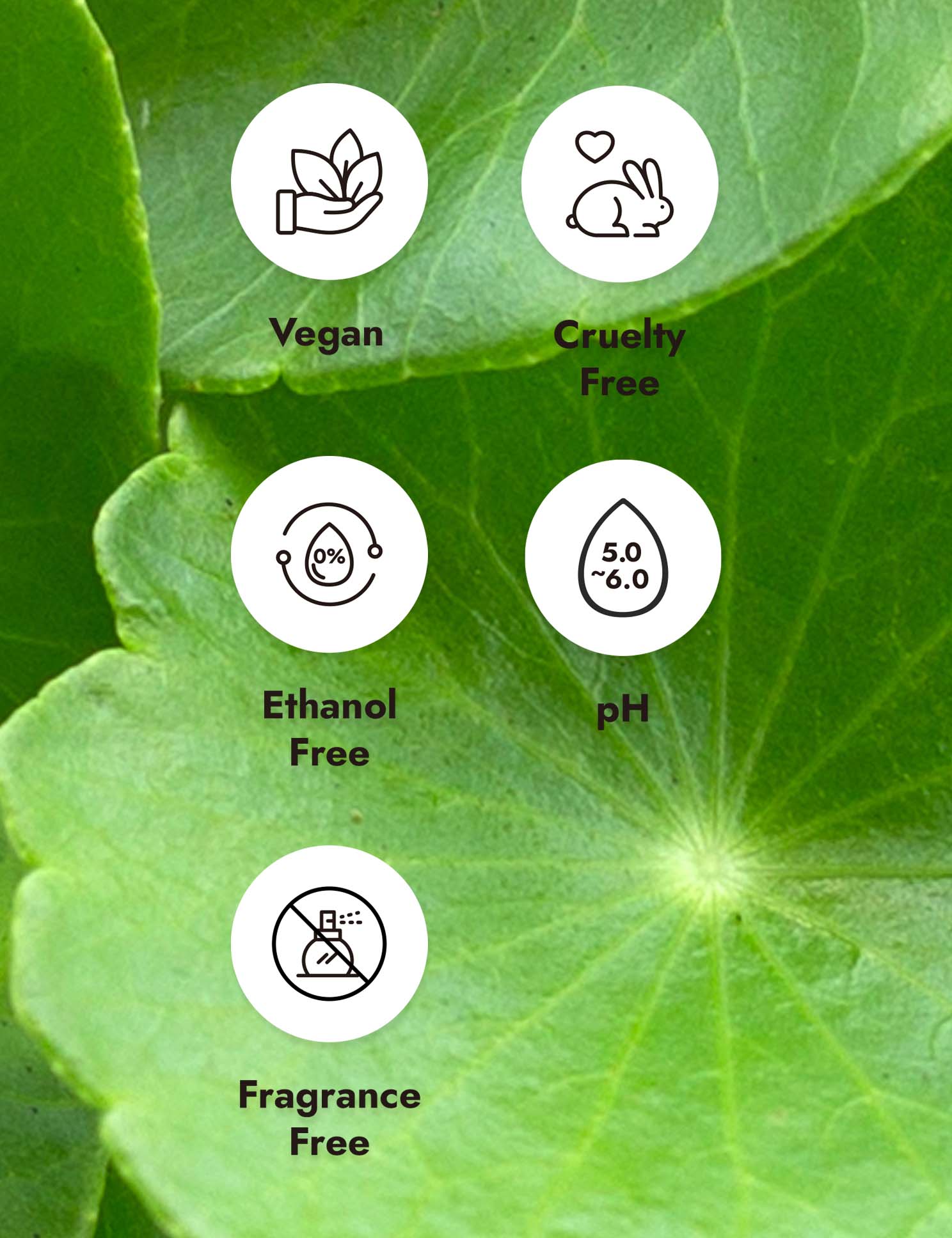 - Ingredients: Centella Asiatica Extract (80%), Water, 1,2-Hexanediol, Methylpropanediol, Betaine, Sodium Hyaluronate (100ppm), Allantoin, Glycerin, Centella Asiatica Leaf Extract, Centella Asiatica Root Extract, Hydroxypropyltrimonium Hyaluronate, Hydrolyzed Hyaluronic Acid, Sodium Acetylated Hyaluronate, Hyaluronic Acid, Asiatic Acid, Asiaticoside, Sodium Hyaluronate Crosspolymer, Potassium Hyaluronate, Madecassic Acid, Madecassoside, Acrylates/C10-30 Alkyl Acrylate Crosspolymer, Tromethamine, Disodium EDTA