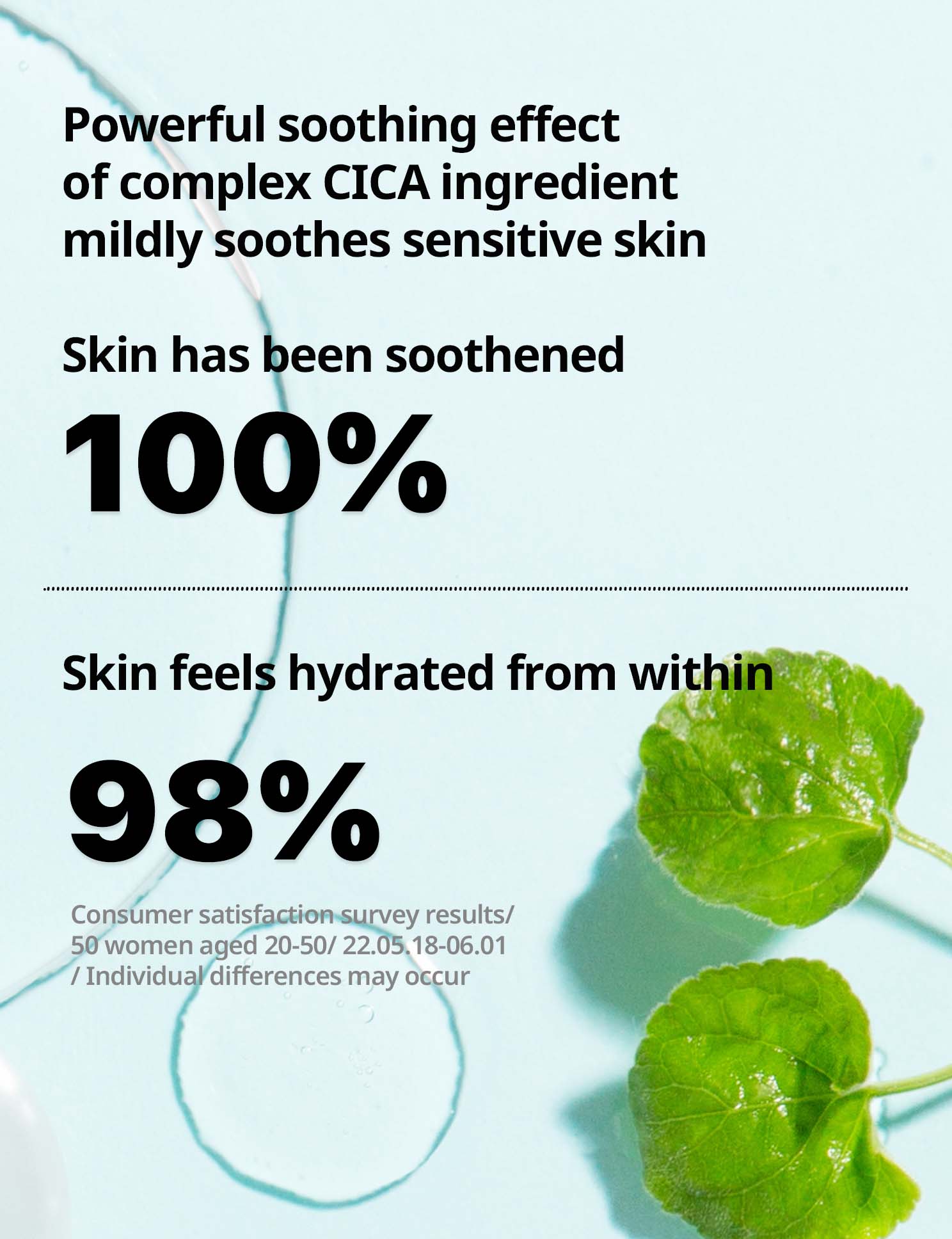 The 80% cica ingredient and hyaluronic acid makes sensitive skin mild and moisturized. 7 types of hyaluronic acid are added to 80% of complex cica ingredients containing centella asiatica extract and 6 types of cica ingredients to quickly soothe sensitive skin. The power of the 80% cica component provides calm and soft skin. The powerful soothing effect of complex cica ingredients gently calms sensitive skin. In order to provide the best soothing solution, the 80% cica component is added to 7 types of hyaluronic acid to provide overflowing moisture and calming effect. 80% of centella asiatica extract helps to soothe the skin and presents a strong calming effect. Centella asiatica leaf extract, centella asiatica root extract, madecassoside, madecassic acid, asiaticoside, and asiatic acid are 6 types of cica ingredients derived from centella asiatica that comforts the skin and adds to its innate strength. 7 types of hyaluronic acid of various sizes supply moisture from the inside to the outer texture of the skin, giving a hydrating feeling. It is a mild formula containing 80% cica ingredients, so you can use it consistently day and night. Being free of fragrance, allergen ingredients, animal-sourced ingredients, 20 cautionary ingredients, pigments, silicone, and ethanol, as well as having a EWG Skin Deep Green prescription, Frankly can be used with confidence as it uses only safe and healthy ingredients. The calming cica ingredients in Cica 80 Hyaluronic Acid Toner gently soothe sensitive and rough skin.