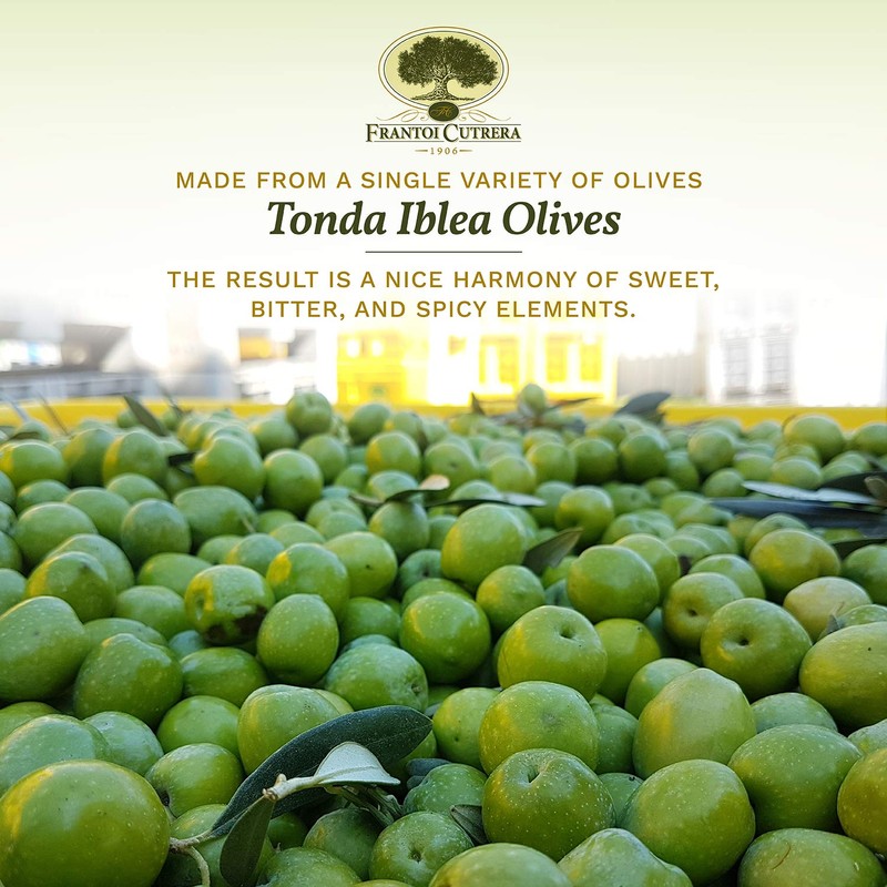 - It is green with golden reflections and Intensely fruity. The notes are elegant and spicy with elements of green tomato. You may notice the clear notes of balsamic herbs and sweet almond, the latter certainly from the single variety Tonda Iblea olives. The result is a nice harmony of sweet, bitter, and spicy elements.