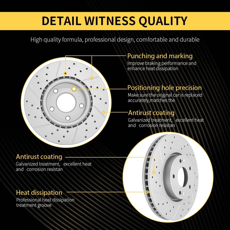 - Improved Braking Performance: Drilled/slotted rotors dissipate heat/expel debris; brake pads deliver superior stopping power. Shorter distances, consistent braking in any weather