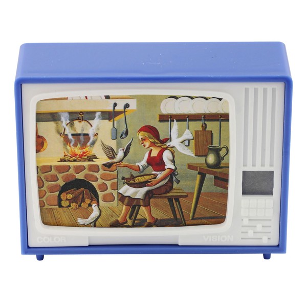 Pure nostalgia. The small TV that tells a fairy tale with pictures. With the push button on the bottom of the nostalgia TV, the pictures inside can be further clicked. Zapping on a channel!