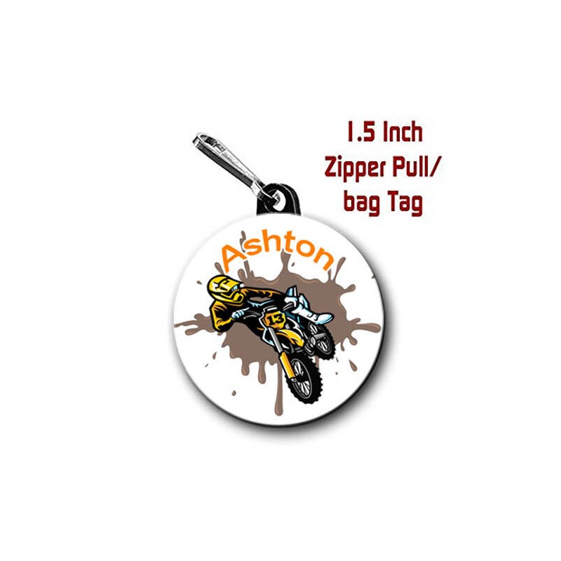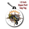 >Two 1.5 inch Zipper Pull/Bag Tags Motocross/Motorcycle graphics with name of your choice