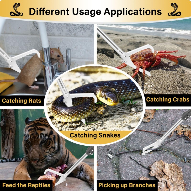 - 【Wide Range of Applications】Snake grabber tool heavy duty are suitable for catching and handling snakes, as well as snake feeding tongs. Snake catching can be used for home yard, snake catcher can be used for camping, removing reptiles, catching and handling separated snakes&catch the rat etc. Snake sticks also suitable for ranch, farm, camping, picking up debris stored high on shelves or picking up twigs and rubbish,also be used as a hiking stick