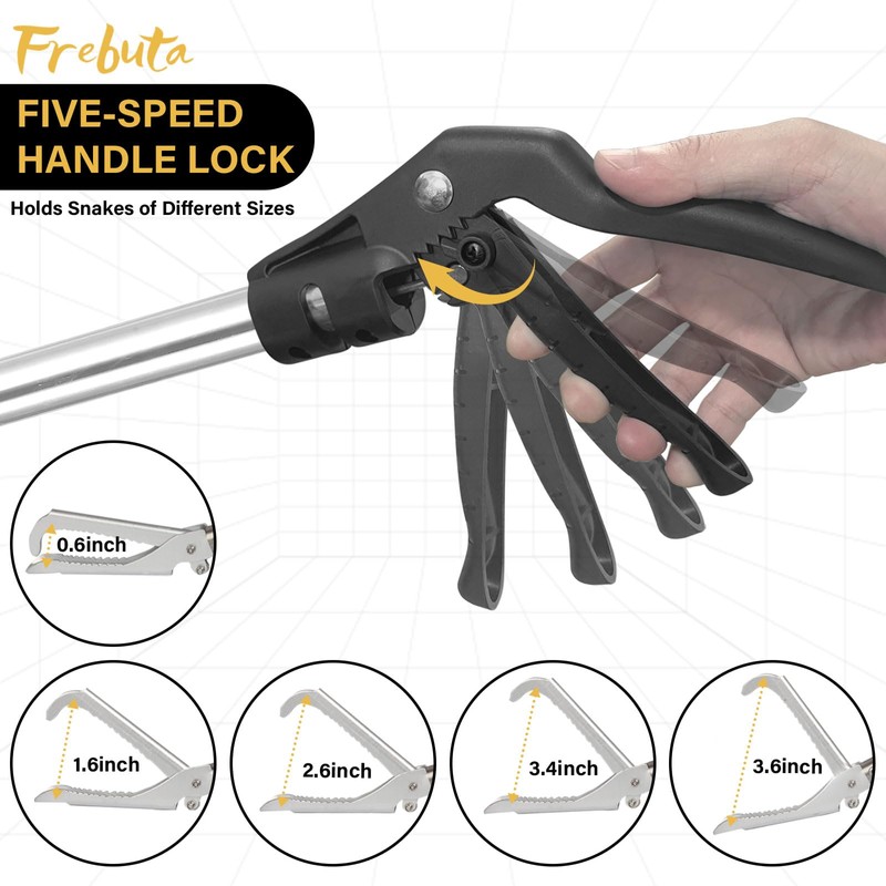 - 【Extra Long Professional Snake Tongs】Frebuta snake grabber tool is 69 inches , the extended snake stick keeps a safe distance from the snake when catching the reptile. Let you do not have to worry about being bitten by the snake at the same time do not have to bend over to catch the snake, snake catcher effectively protect your back!
