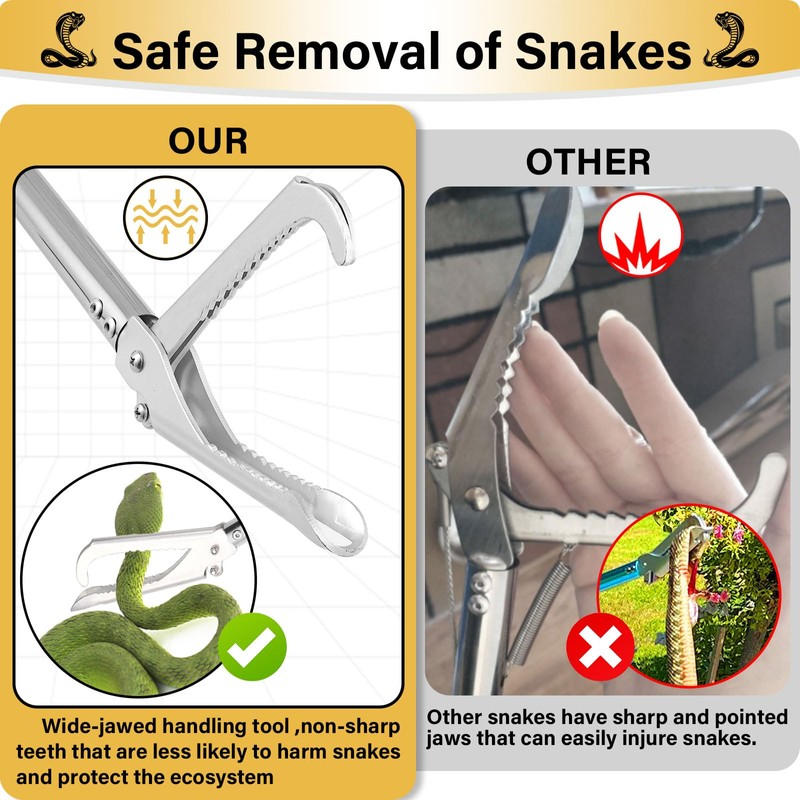 - 【Wide Jaw Snake Jaws】Snake tongs cacher have smooth wide serrated blunt teeth clamps, catching snakes is not easy to injure snakes, snake grabber tool make it easy for you to stay away from harmful snakes, snake catcher grabber handling snakes away from your cozy home home at the same time do not have to worry about the emergence of rats