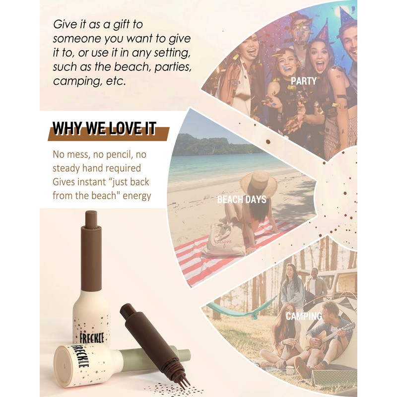 - How to Use - For initial use, rotate the top button to unlock the product, ensure the brush is tightly screwed to the bottle, press the top button 3-5 times to fully saturate the brush with product gently tap on your arm to test the color intensity, using the freckle stamp ending, gently dab on the desired spots, light taps create natural, subtle freckles, while heavier presses result in bold, statement freckles.