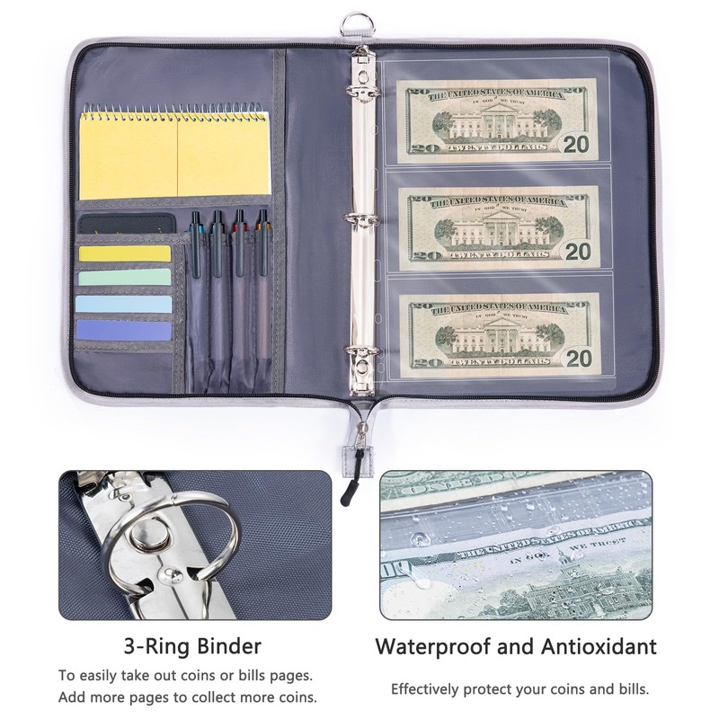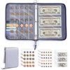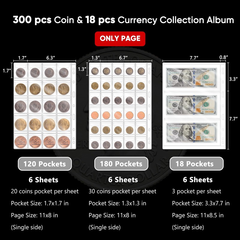 - Spacious Coin and Currency Storage: The coin album accommodates up to 45mm in diameter, including pennies, quarters, Silver Eagles, gold dollars, half dollars, and more. Each plastic sheet features Currency Storage: 20 pockets per page, holding over 120 coins; 30 pockets per page, fitting 180 coins. It also includes 6-bill currency sleeves with 18 pockets for paper money and stamp collections.