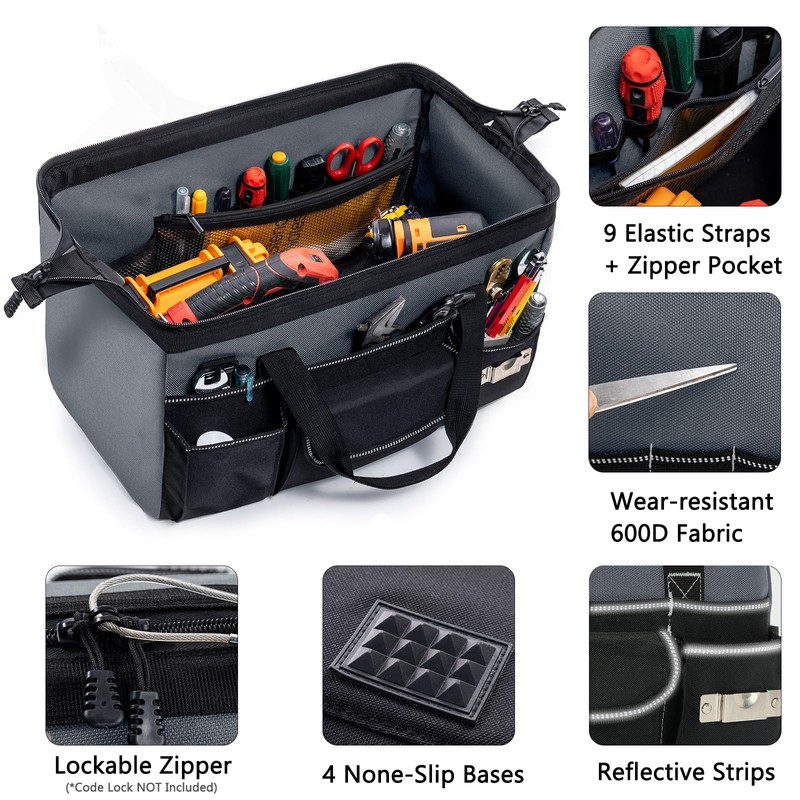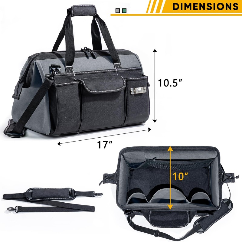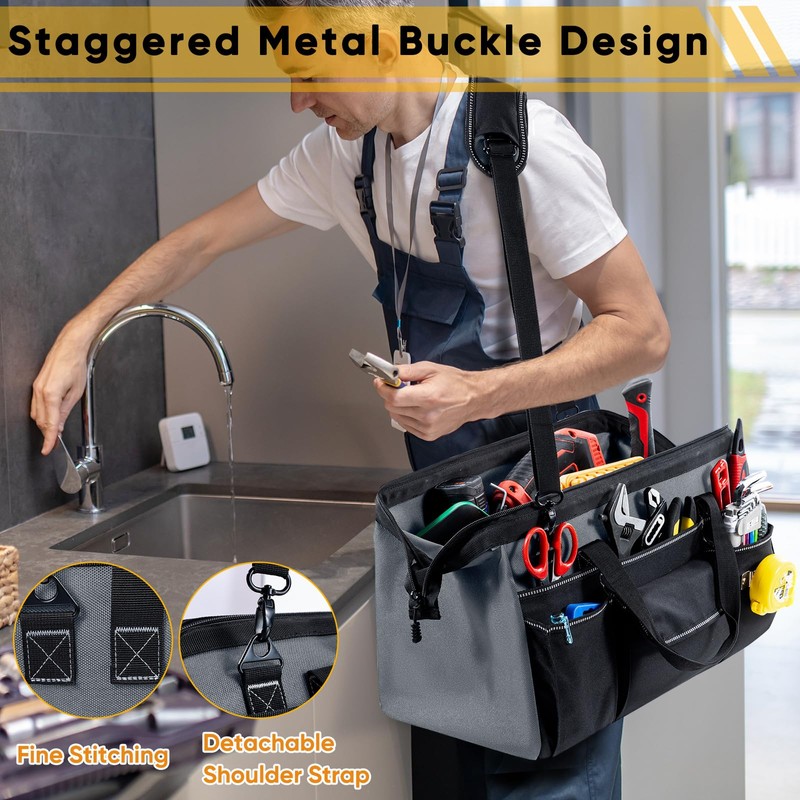 - 🔧 Complete Tool Storage Solution:This 17-inch tool bag features 22 built-in pockets for organizing wrenches, screwdrivers, hammers, drills, and more. Ideal for mechanics, electricians, plumbers, and DIYers—everything stays secure and easy to find.
