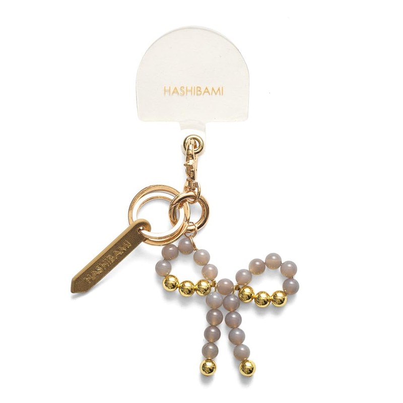 [ハシバミ] キーチェーン リボン天然石 スマホハンドストラップ グレーオニキス FREE