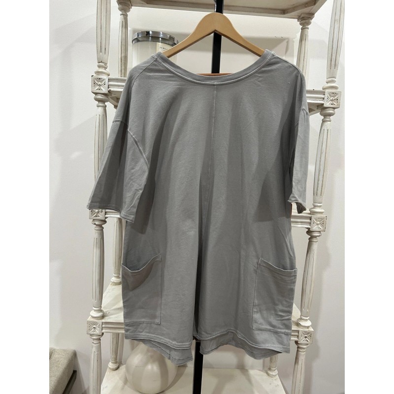 Features: Soft fabrication with a stretchy feel, scoop neckline, ribbed trim, patch pocket detail at front, V-shaped back, dropped sleeves, raw hemlines