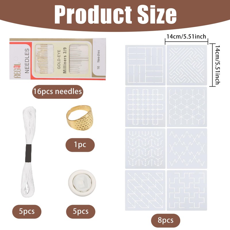 - Complete Sashiko Tools Set: Contains 8 PET stencils, 16 needles, 5 white threads, 5 rubber finger guards, and a metal thimble—everything for beginners to start stitching immediately