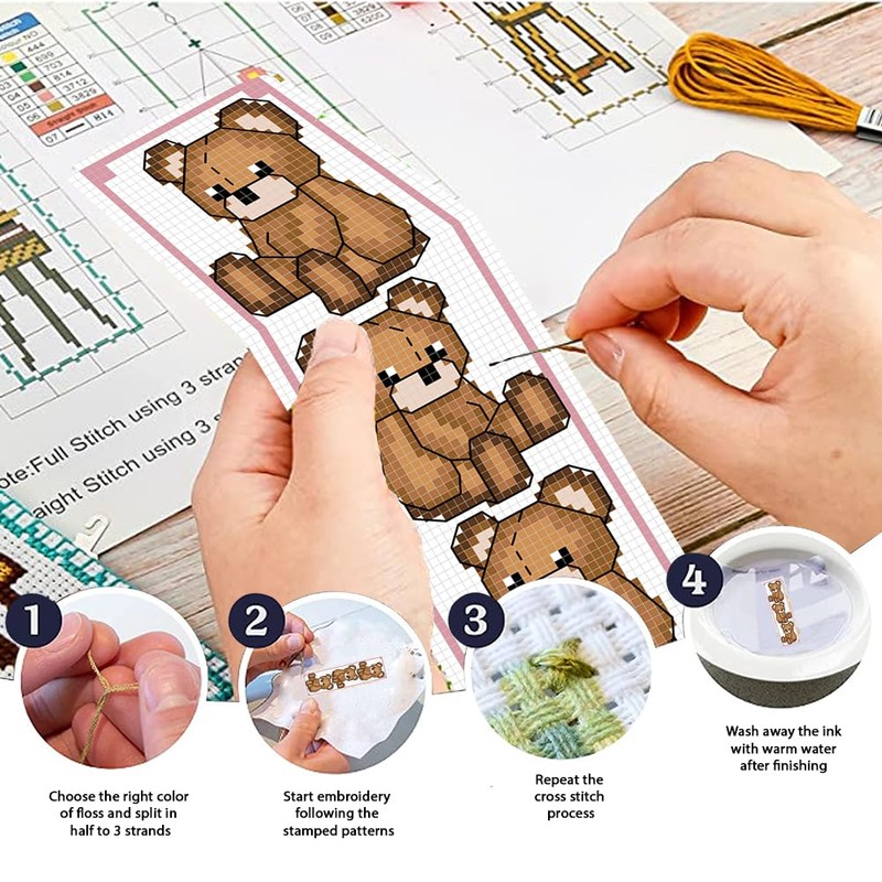 FREEBLOSS 6 Set Cross Stitch Bookmark Kits Stuffed Bear Pattern Stamped Cross Stitch Kit Stamped Embroidery Bookmarks Kit for Adults Beginners with Clear Instructions