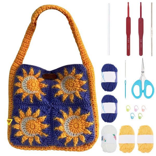 FREEBLOSS Crochet Kit for Beginners Crochet Bag Starter Kit Granny Square Crochet Tote Bag Set Sun Crochet Bag Knitting Kit with Step-by-Step Video Tutorials Adult Crafts Projects