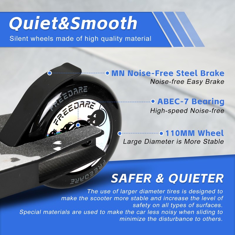 - 【SMOOTH & LIGHTWEIGHT】FREEDARE stunt scooter is 8 lbs and equipped with IHC compression headset system, durable high-resilience 110mm PU wheels and sealed with ABEC-7 bearings, making your ride sleek, smooth and fast without noises. The flexible nylon/MN steel rear braking mechanism works efficiently also.