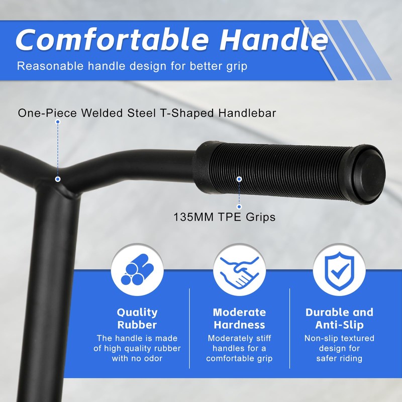 - 【STURDY & DURABLE SCOOTER】Aircraft-grade 6061-T6 heat-treated aluminium deck with the size of 4.3”(W) x 20.1”(L) can withstand the high impact of stunt landing, improving the landing shock absorption considerably. Meanwhile, the one-piece welded connection between 3D-stamped steel fork and deck makes the impact capacity up to 1800 lbs, solid enough for tricks in skate parks. The maximum load capacity up to 220 lbs, meet the various demand of players at different age and weight.