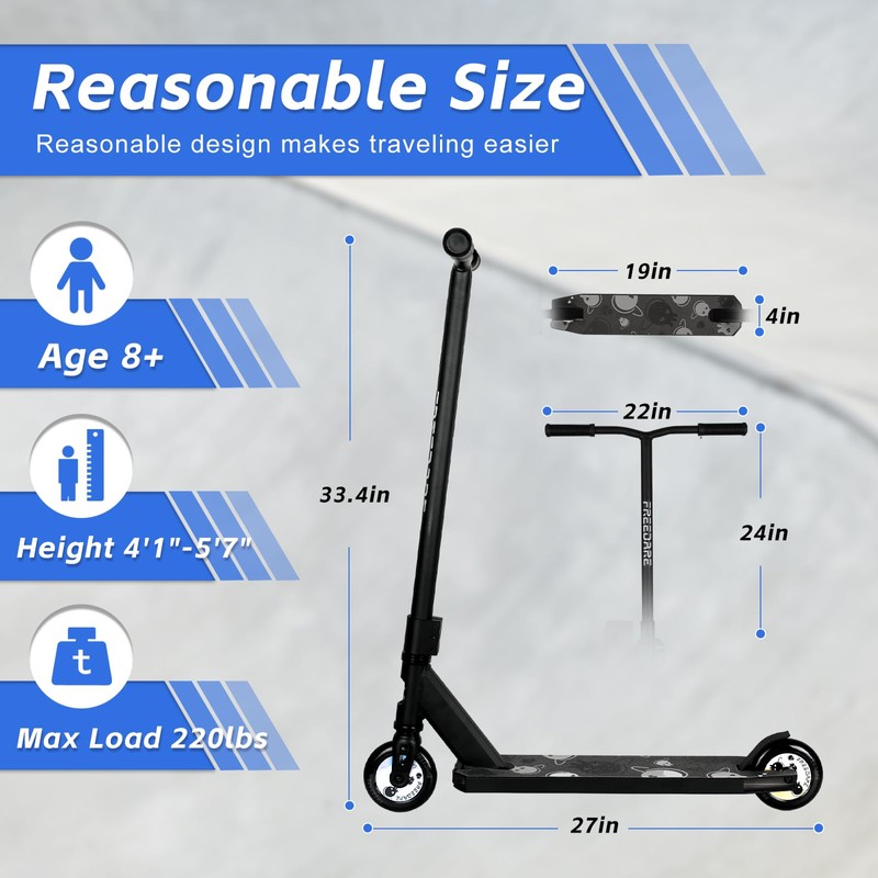 - 【UNIQUE PACKAGE BOX】FREEDARE pro trick scooter is packed by a well-designed box which is stylish and unique, which makes the scooter super suitable for your loved one as a birthday gift, Christmas gift or new year gift.