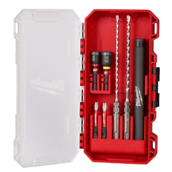 Our SDS Plus M/2™ 2-Cutter Concrete Screw Installation Kit provides a durable and versatile solution for fast installation of concrete screws. This complete drive system is designed for concrete screw drilling AND driving applications, allowing you to use only one tool for the job – resulting in increased productivity and fewer bit swaps. Our SDS Plus Bits with 1/4" Hex are designed specifically for concrete screw applications. Built to take on brick, block, and concrete, MILWAUKEE® M/2™ SDS bits feature 2-Cutter geometry for fast drilling and debris removal. These bits are engineered with a built-in hex collar for perfect hole depths. The included magnetic SHOCKWAVE Impact Duty™ Concrete Screw Nut Drivers bear a recessed shoulder feature, which prevents concrete screws from snapping during installation and ensures the anchor is set to the perfect depth. Our Drill/Drive sleeve connects to the drill and driver bits for quick and easy anchor installations without carrying two tools and extra bits. Optimized for performance in any SDS Plus tool. Packaged in a medium, single-sided hard case designed for use in PACKOUT™.Condition
