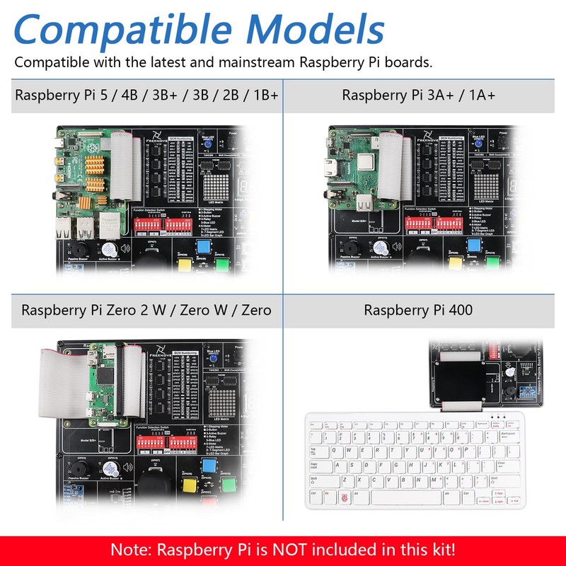 - Compatible Models: Raspberry Pi 5 / 400 / 4B / 3B+ / 3B / 3A+ / 2B / 1B+ / 1A+ / Zero 2 W / Zero W / Zero (NOT included in this kit)