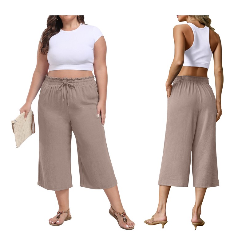 FREEOAK Womens Plus Size Wide Leg Flowy Pants High Waist with Drawstring Pockets Capri Cropped Pants for Beach Vacation 2025 Taupe Size 4X-Large