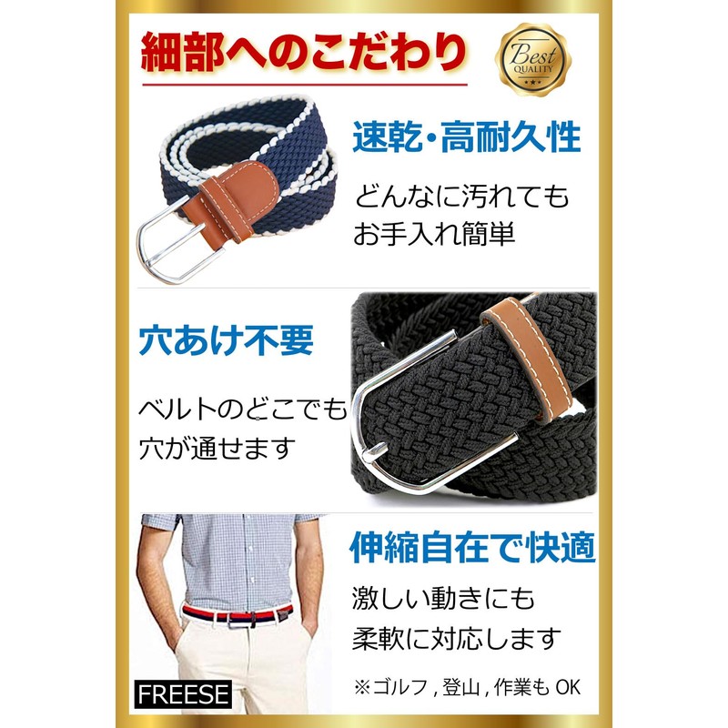 - (Unbelievably resistant to sweat and movements) The belt is made of highly functional polyester fabric. It is sweat and water resistant and has excellent durability and prevents deterioration, discoloration, and deformation. Especially for golf, sports, etc. due to sweat, movement and elasticity, the load on the belt is usually larger. However, this braided mesh belt is also resistant to the burden on the belt, making it durable and long lasting. Can be used safely for a long time. (One size fits all) One size fits all woven mesh belt that allows belt holes to pass through anywhere. Can be used with pants, pants, slacks, and any bottoms at the waist so you can freely adjust the size. No need for adjusting the length of the belt or drilling holes at all. Can be used immediately when it gets at hand: Insert the buckle pin into the gap of the belt and hold it. No need to remove or cut the main unit. Can be used as is