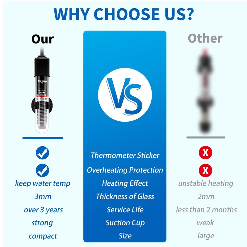 Compact Size: The small aquarium heater can easily meet your need, no matter how small your fish tank is.