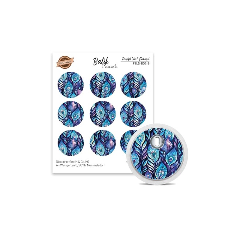 FreeStyle Libre 3 Sensor Stickers, Set of 9 "Batik Peacock" Stickers for Sensors Diasticker®