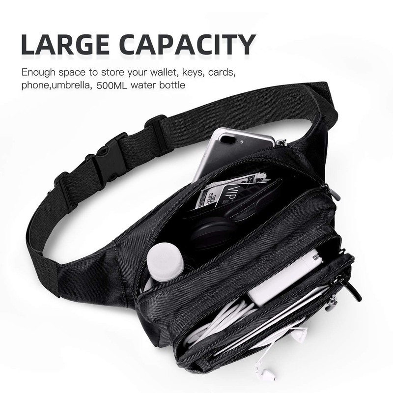 The FREETOO black fanny pack features 5 zippered compartments of various sizes to keep your essentials neatly organized. The largest pocket easily fits a standard 16oz water bottle, while a hidden zipper pocket inside the main compartment secures your valuables for extra protection. A flat zippered pocket on the back rests against your body for easy access to smaller items. Stay organized while maintaining a slim and sleek profile!