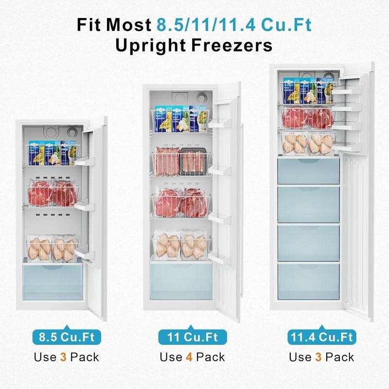 - [Fit Most 8.5 / 11 / 11.4 cu.ft Upright Freezer] Freezer bin size is 15.7" x 11.4" x 5.9", designed for 8.5 / 11 / 11.4 cu.ft freezers. The basket is high and deep, providing a larger capacity to hold more items; it keeps items securely in the basket, so they won't fall out or hit your feet when open the freezer door