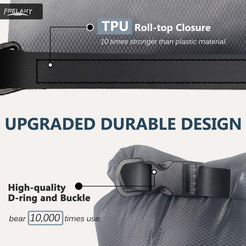 - UPGRADED DURABLE DESIGN: The dry bag is made of diamond ripstop polyester, and the roll-top closure is made of strong TPU material 10 times stronger than plastic. The sturdy D-ring and buckle can withstand up to 10,000 uses and are easy to attach to your backpack.
