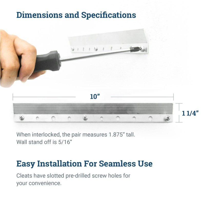 - Cleat hanger supports 50 pounds and is 10 inches long. Kit includes cleats and all fastening hardware to hang 30 pieces