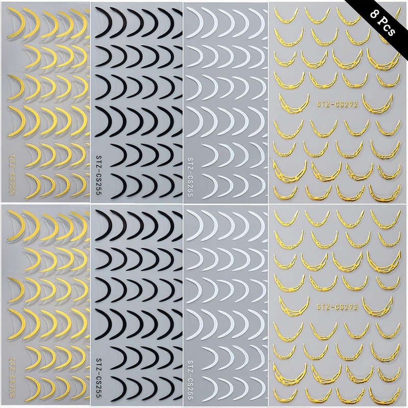 - Quantity -- 8 sheets exquisite French lines nail art decals. 350+ U-shaped line nail designs. Gold/ black/ white/ rose gold 4 color options.