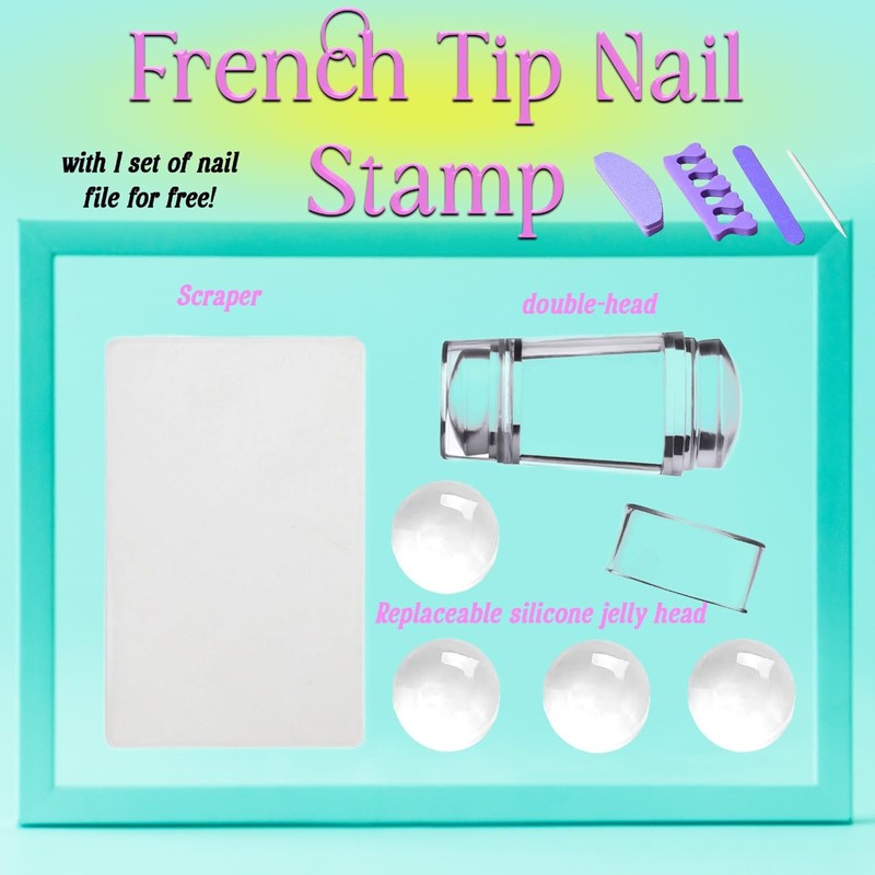 - All-in-One French Tip Tool Set – Includes 1 nail stamper holder, 4 replaceable silicone stampers, and bonus nail tools to help you create salon-style tips at home.
