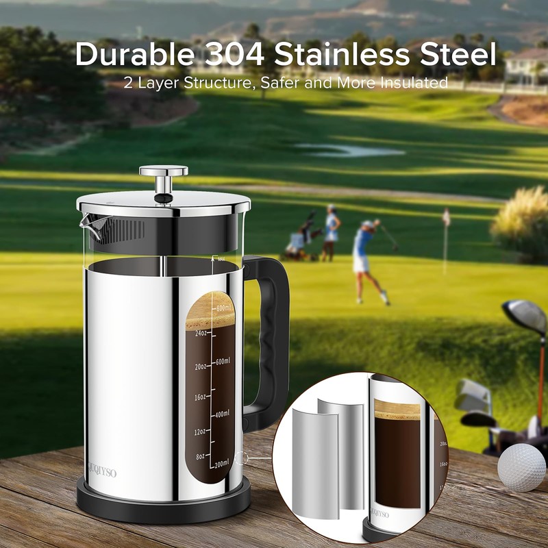 - 【SUPER FILTERING】The quality of the french press greatly depends on the quality of the filter element. So the selection of springs is extremely important for the filtering of coffee powder, which will directly affect the taste of coffee. Our perforated plate could filter out big coffee grounds, and the 80 mesh filter could filter out tiny coffee ground