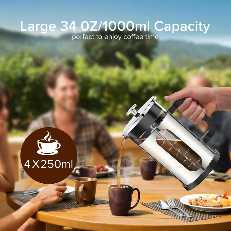 French Press Coffee Maker, 304 Stainless Steel Cold Brew Coffee Maker with 4 Filter, Heat Resistant Borosilicate Glass, Easy to Clean, BPA Free Iced Coffee Maker Rust-Free Coffee Press, 34ounce,Silver