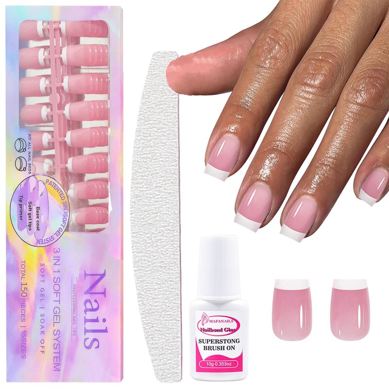 French Tip False Nails Kit - 150Pcs French Tip Press on Nails Short - 3 In 1 Soft Gel Fake Nails Square in 15 Sizes - Short Fake Nails Set with Glue and Nail File
