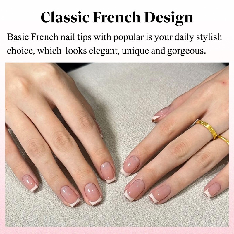 - 【Easy to Use】Press on nails french tip come ready to wear, no base coat required. Apply glue on the nail, then select the right size of acrylic nails, put on the short square false nails and press on them for 30s. Then you will get a nature and beautiful manicure.