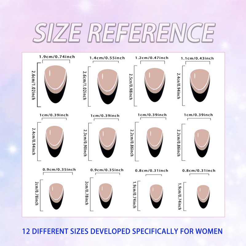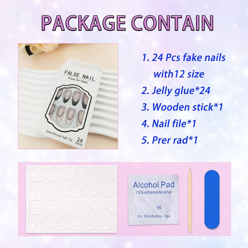 - 【What's Include】12 nail sizes 24 almond press on nails medium ensure a totally custom fit, plus we give you everything needed just in case! Each set comes complete with a storage box, adhesive tabs, double-sided nail file, cuticle stick, and prep pad.