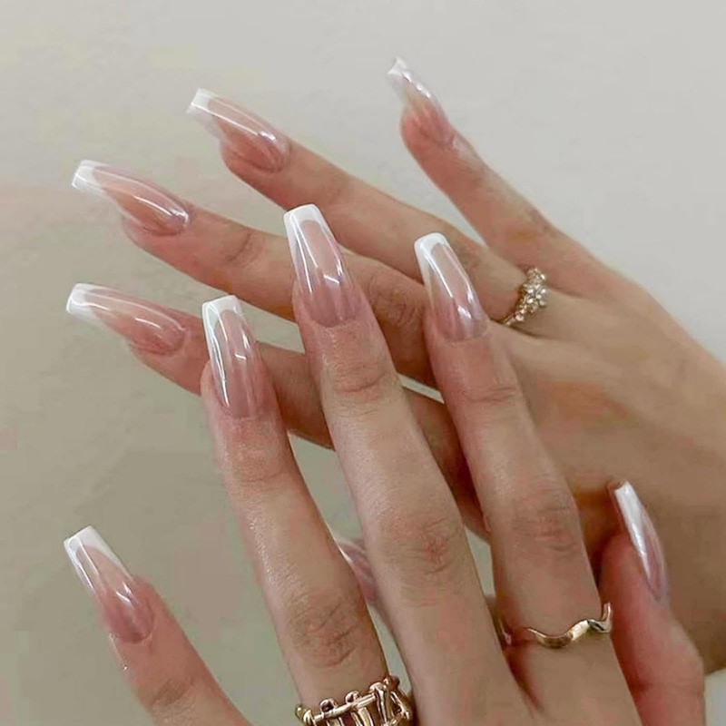 French Tip Press on Nails Coffin Medium Fake Nails Nude False Nails Press ons with Designs Glossy Full Cover White Glue on Nails Acrylic Stick on Nails for Women Manicure Nails Decoration 24Pcs…