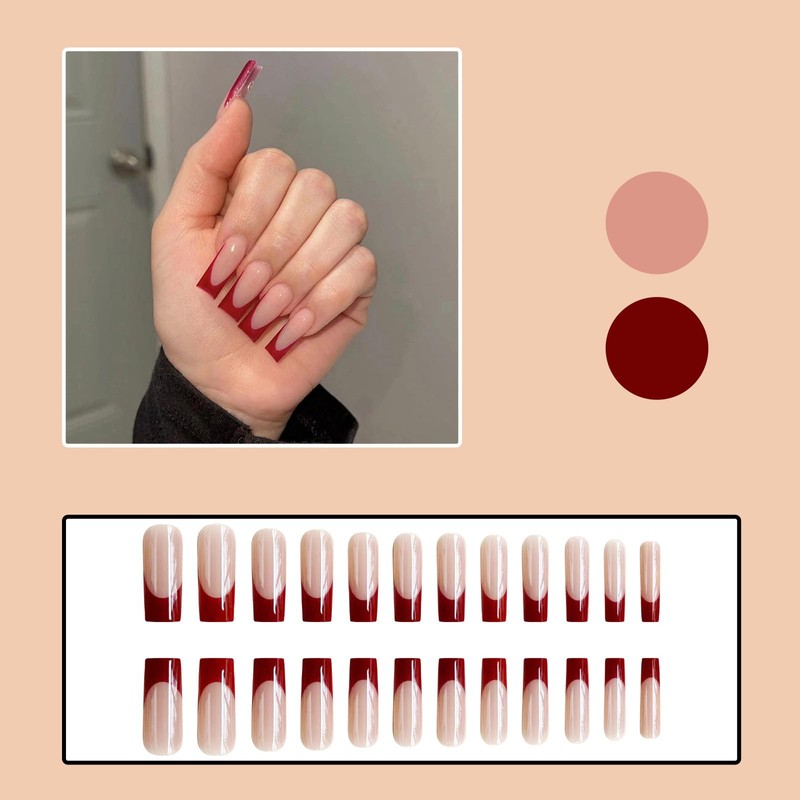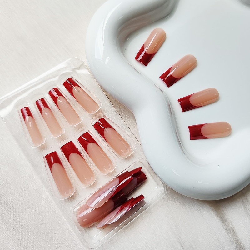 French Tip Press on Nails Long Fake Nails Red False Nails with Design Square Acrylic Nails Full Cover Artificial Nails Cute Press on Nails Glossy Stick on Nails Glue on Nails for Women DIY Manicure